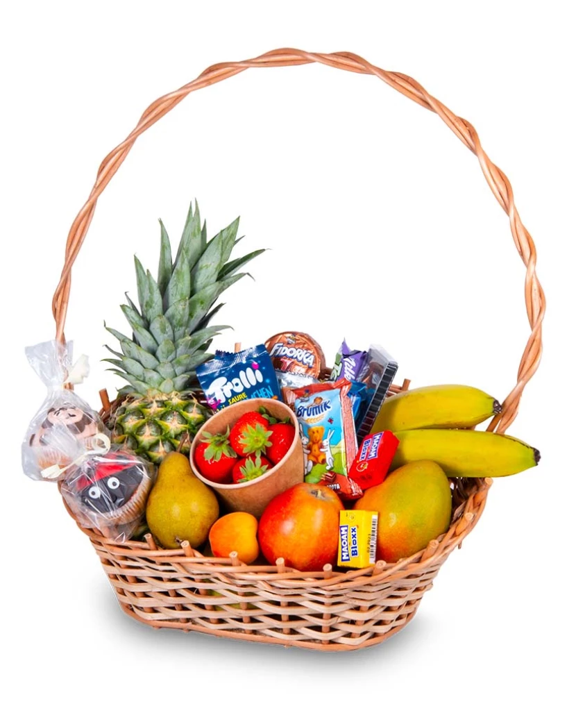 Dárkový koš s ovocem a sladkostmi se skvěle hodí jako dárek pro děti nejen na Den dětí, ale také mnoho jiných příležitostí. Obsahuje čerstvé ovoce - ananas, jahody, hrušky, mango, banány, jablka a oblíbené dětské čokoládové sladkosti - bonbóny Maoam, čokoláda Milka, Brumík, Fidorka a další dětmi oblíbené sladkosti.