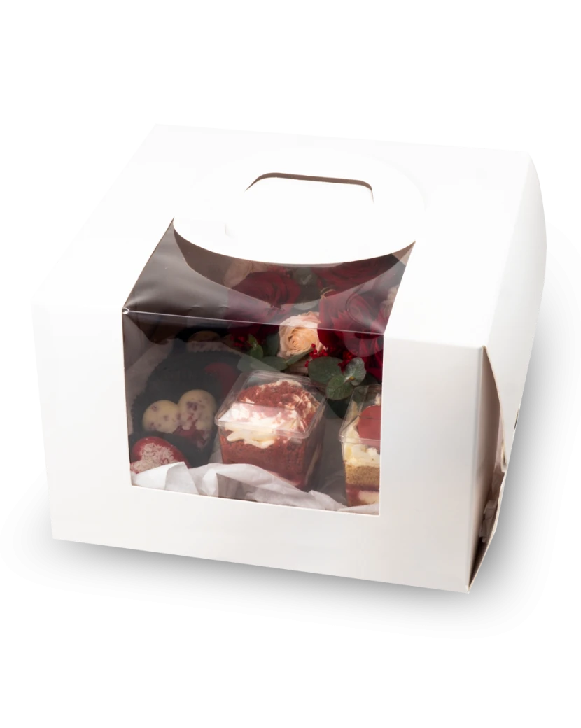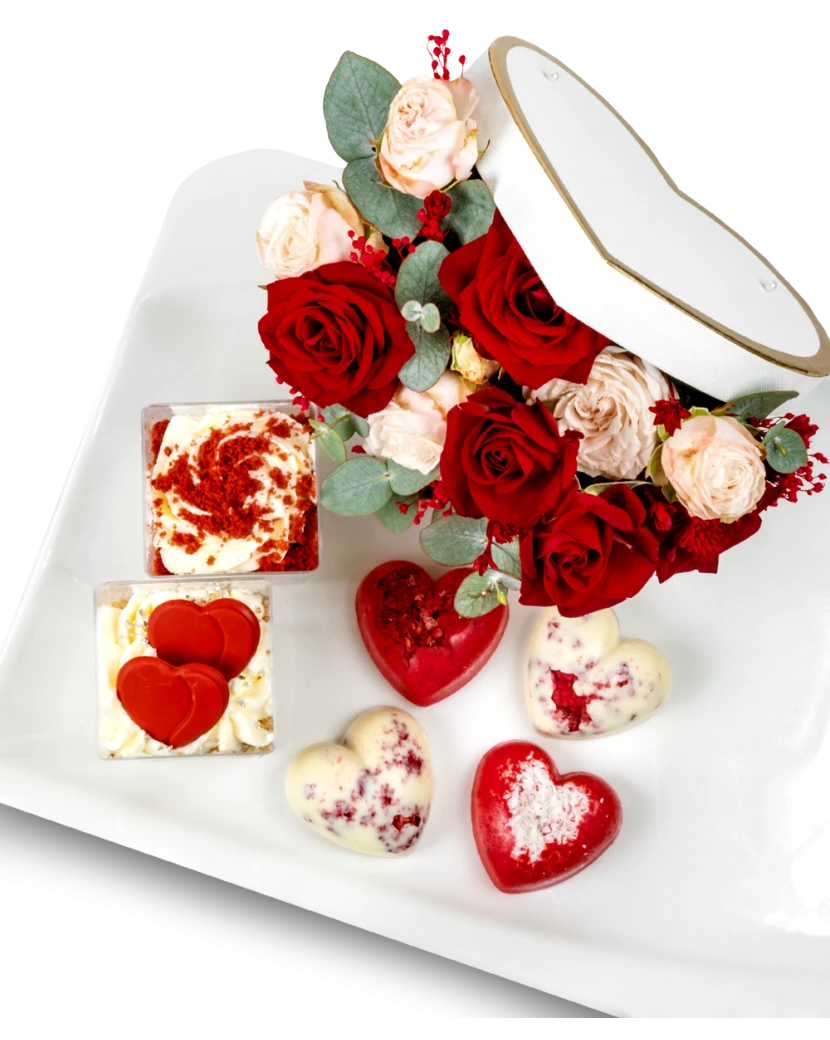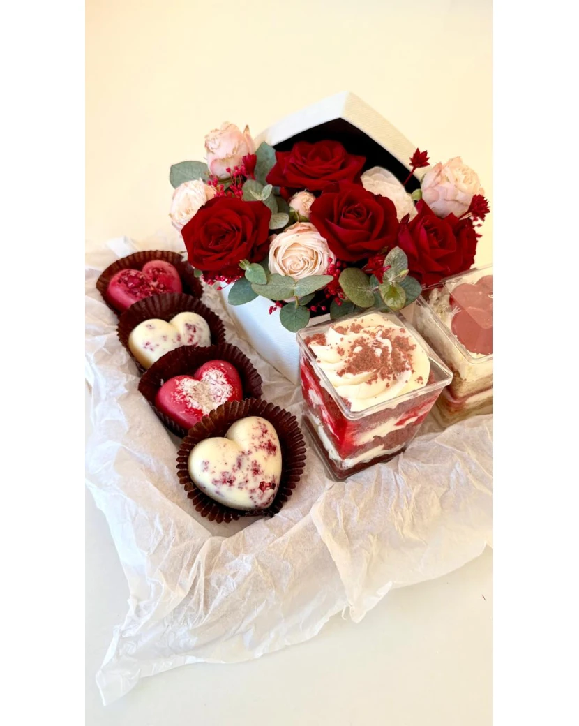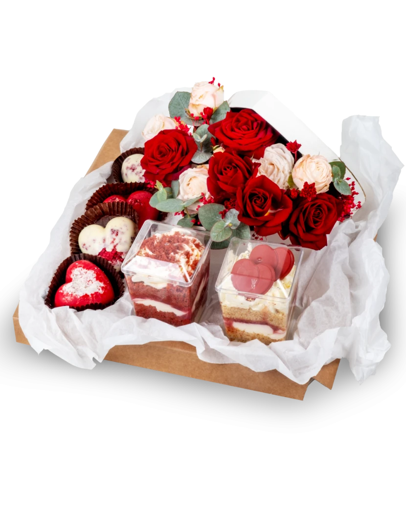 Eine luxuriöse süße Geschenkbox mit Blumen und Desserts ist die ideale Wahl, wenn Sie ein originelles essbares Geschenk suchen, das die Schönheit frischer Blumen mit feinem süßem Genuss verbindet. Die elegante Box enthält sorgfältig arrangierte Rosen in Kombination mit einer Auswahl beliebter Desserts – Desserts im Glas und Schokoladenpralinen.