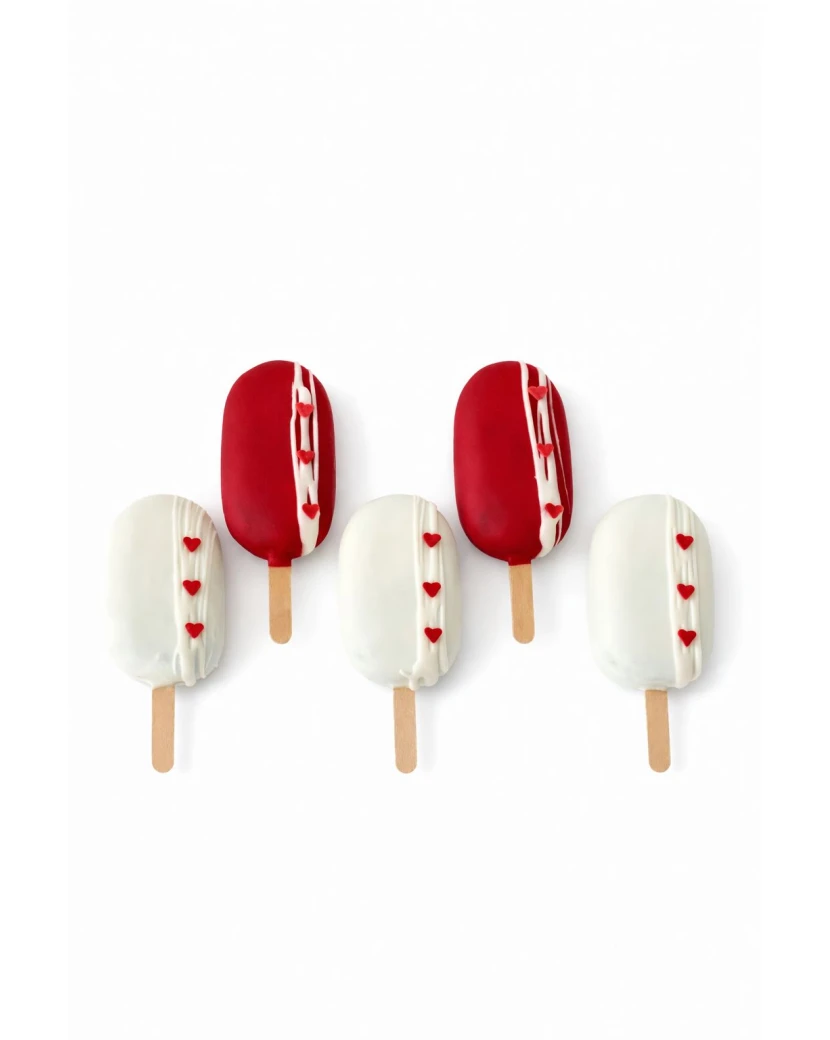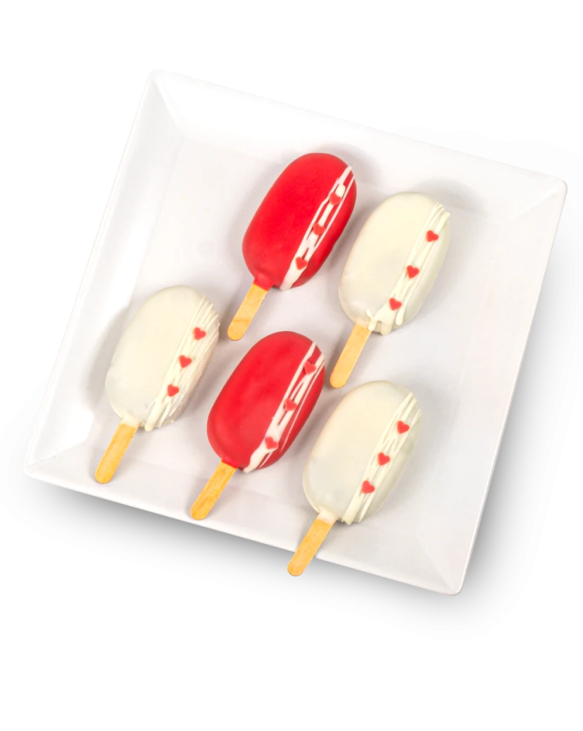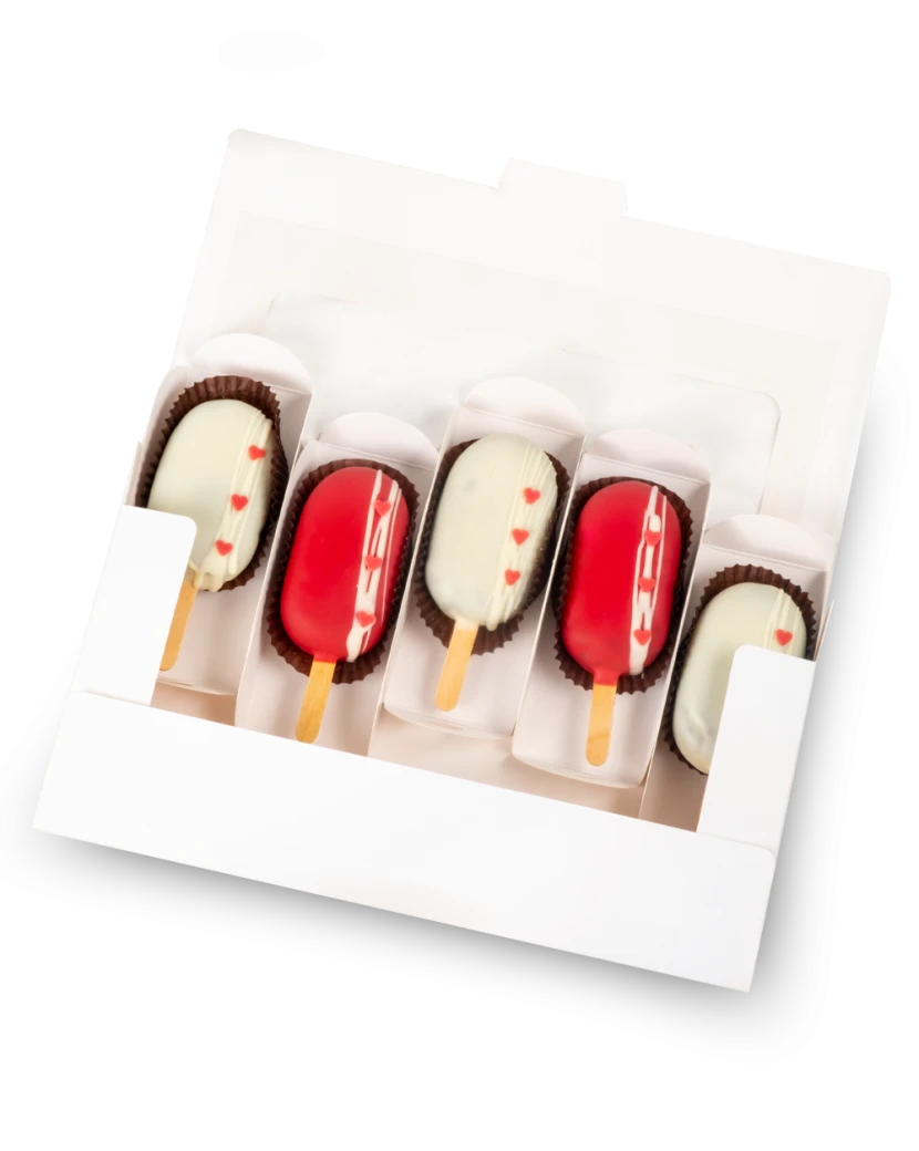 Baked cake popsicles with Belgian chocolate hearts are perfect as Valentine’s Day gifts and, in general, as gifts for women for any occasion. These mini cakes are made from sponge cake mixed with mascarpone cream and Belgian chocolate. They are decorated with white Belgian chocolate and sprinkles. In taste, cake popsicles are similar to cupcakes and in English they are called cake popsicle or cakesicle, which is a combination of cakes and cake pops. We also offer classic cakes, including a heart-shaped cake and a romantic cake with hearts.