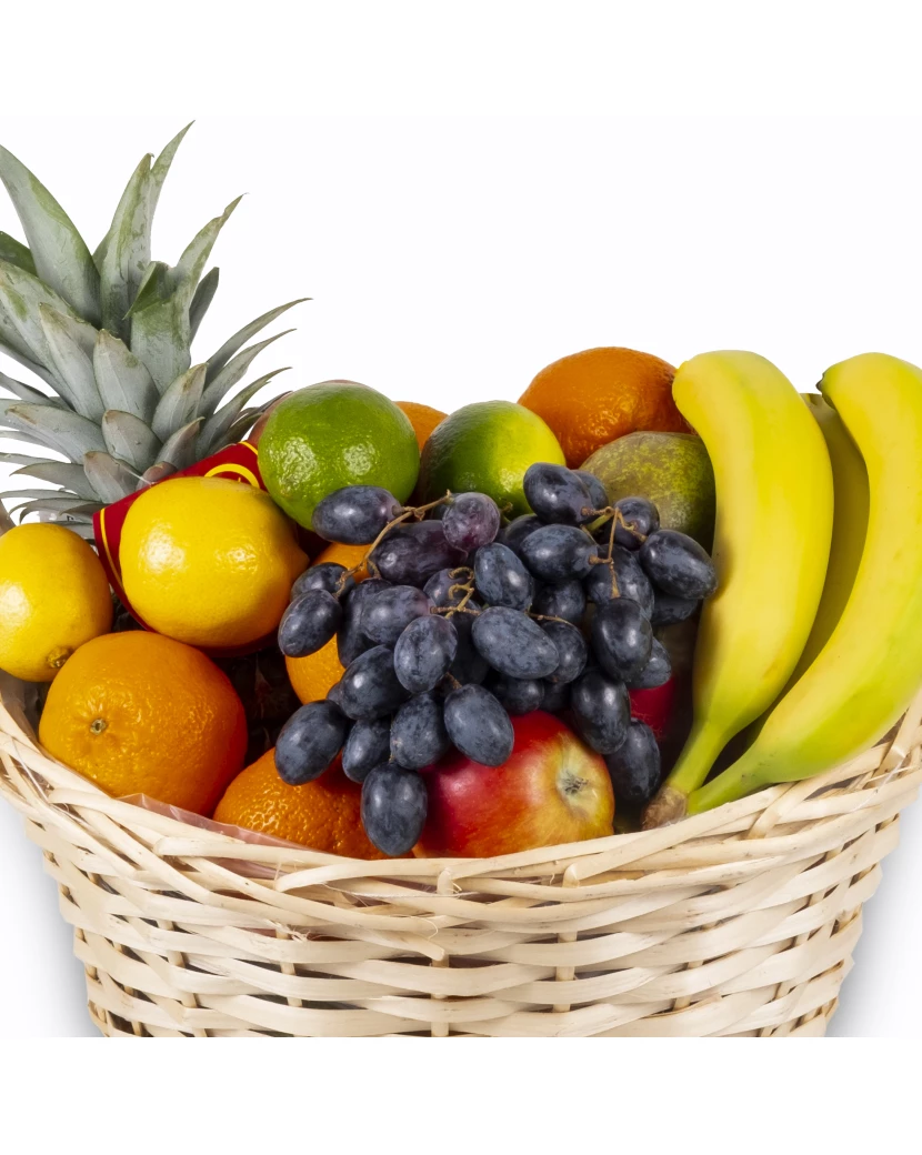 Large Fruit basket full of citrus fruit like grapefruit, lemon, limes, oranges and other fruit like pineapple, kiwi, apples, pears and bananas will add you all necessary vitamins and energy. This wicker gift basket is full of fresh fruit, wrapped in transparent cellophane foil with ribbon to become a glamorous and healthy gift.