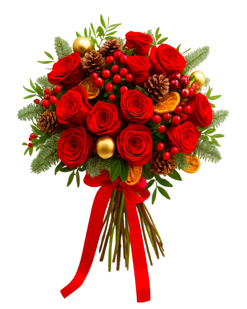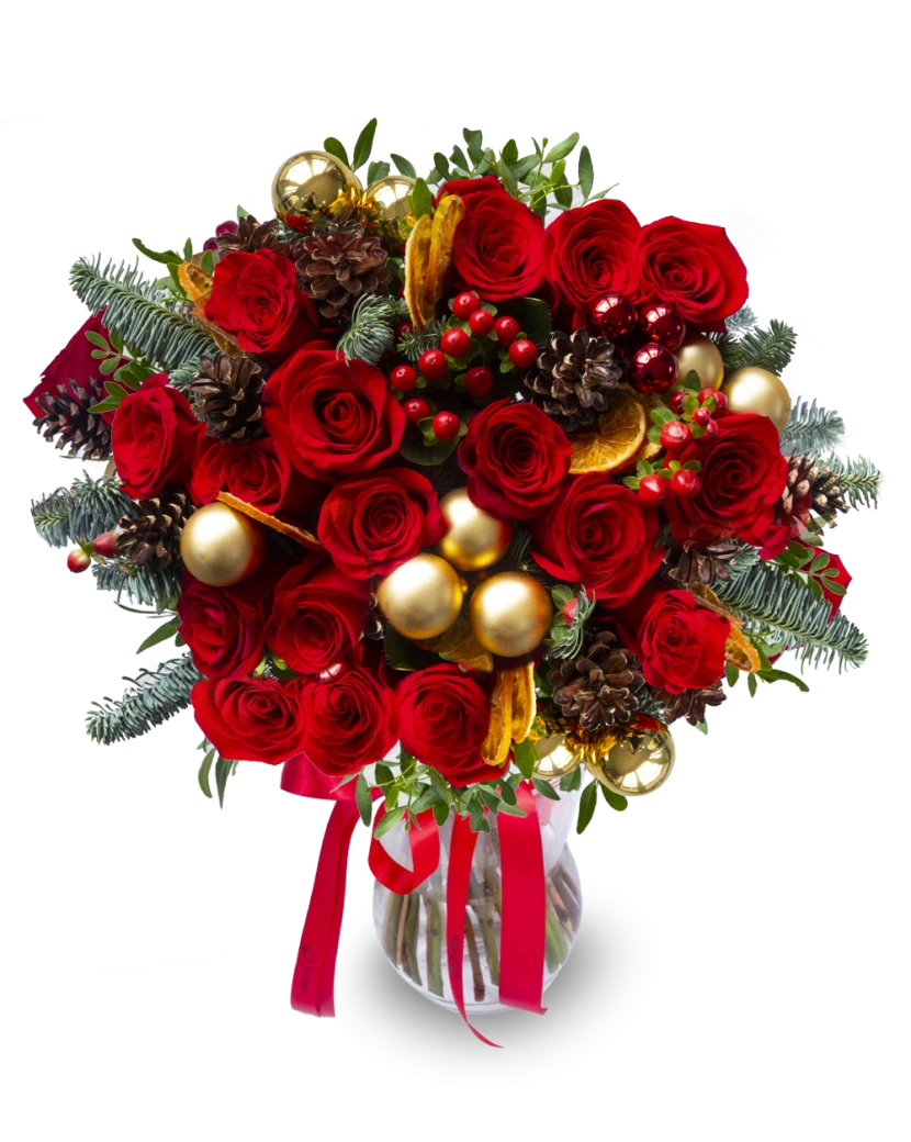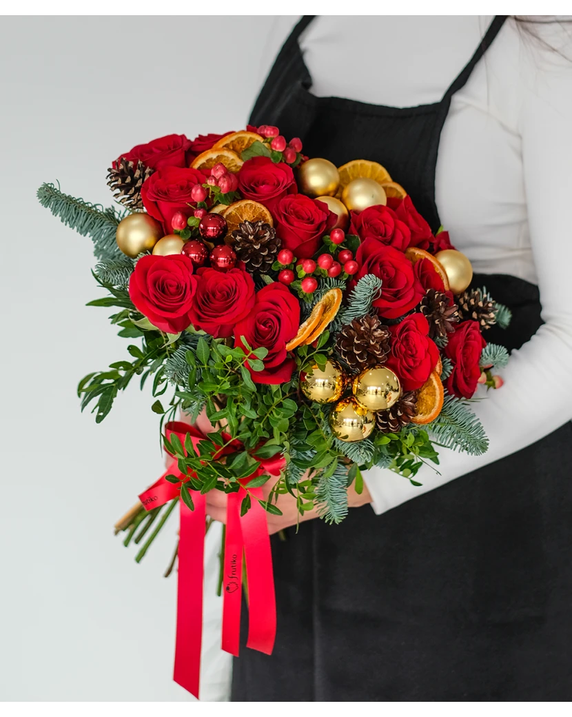 The Christmas Rose flower is a stylish winter bouquet that combines the elegance of red roses, red hypericum, and natural elements such as pine needles, pine branches, pine cones, and dried fruit. It is complemented by delicate Christmas decorations, which give it a festive look and perfectly match the pre-Christmas atmosphere. This beautiful bouquet is the ideal gift for any winter occasion – it will delight, surprise, and instantly create a festive mood. We deliver freshly arranged bouquets throughout Czechia.