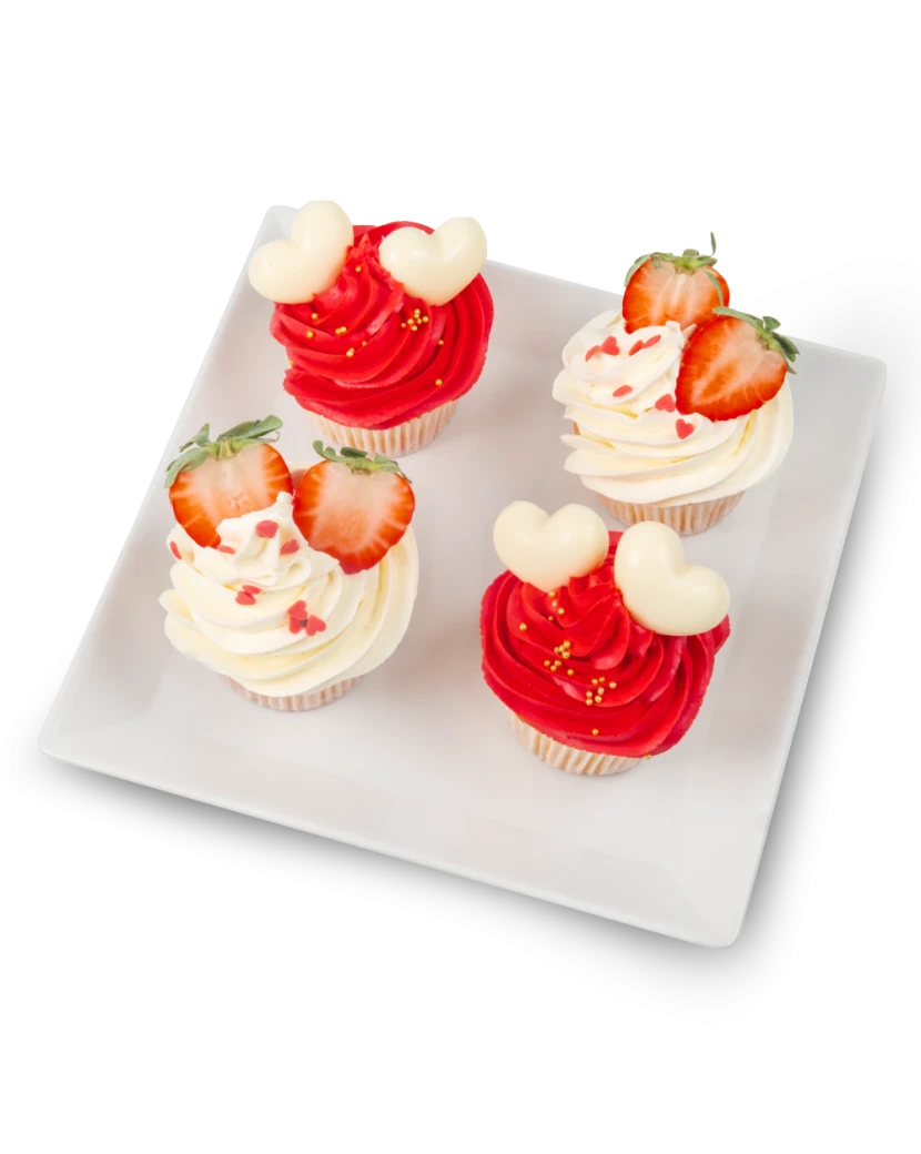 Ingredients: Strawberry, Chocolate, White chocolate, Chocolate heart, Cream for cupcakes, Muffins, Red Cocoa Butter