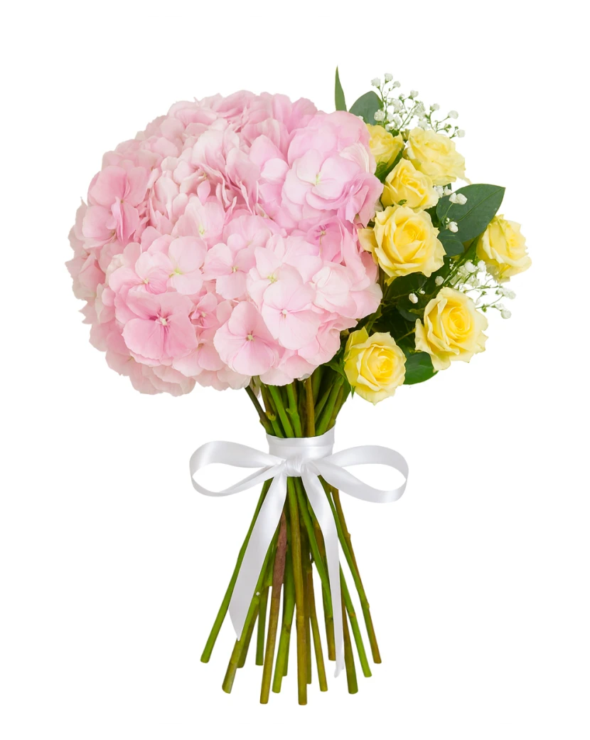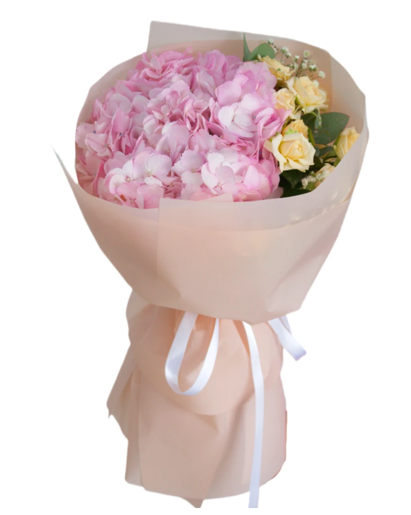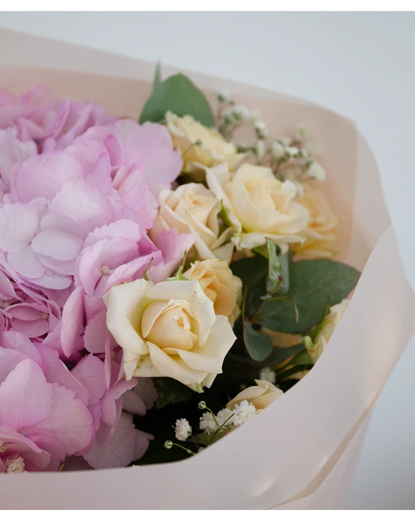 кустовые розы, Эвкалипт, гипсофила, гортензия