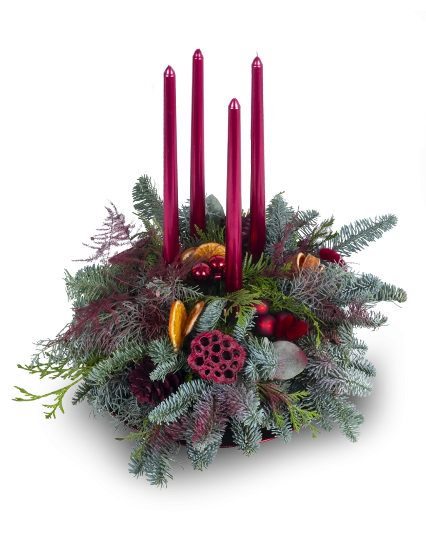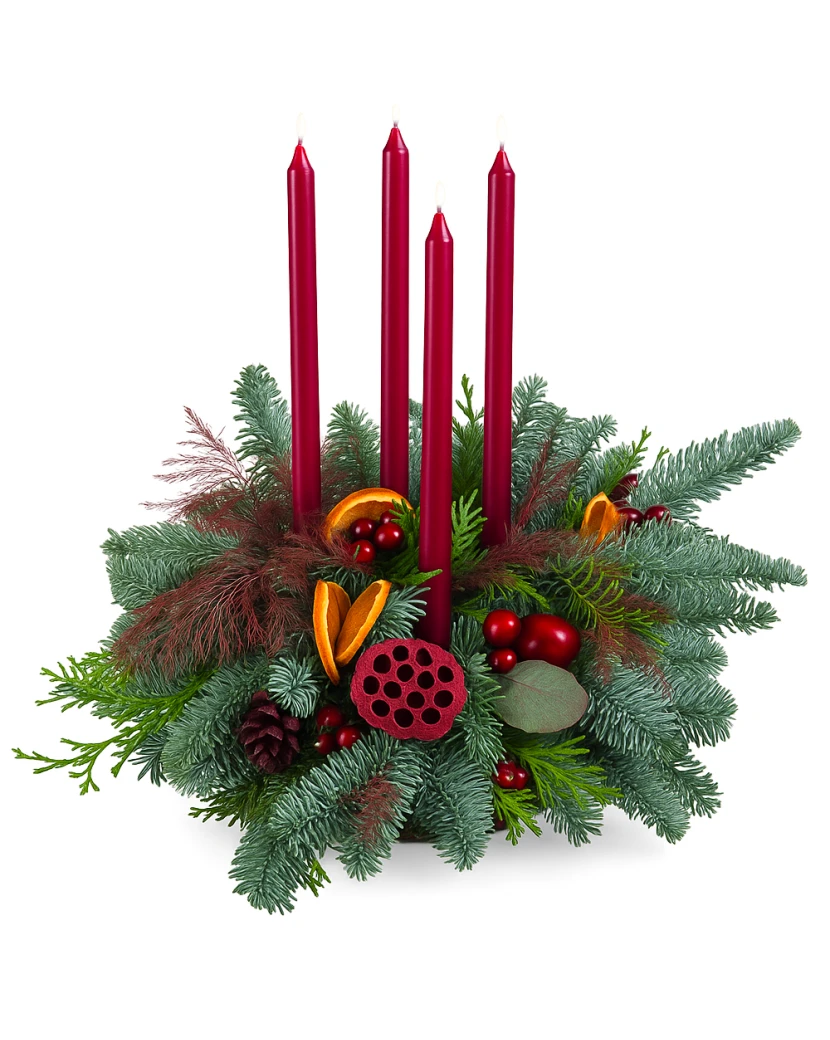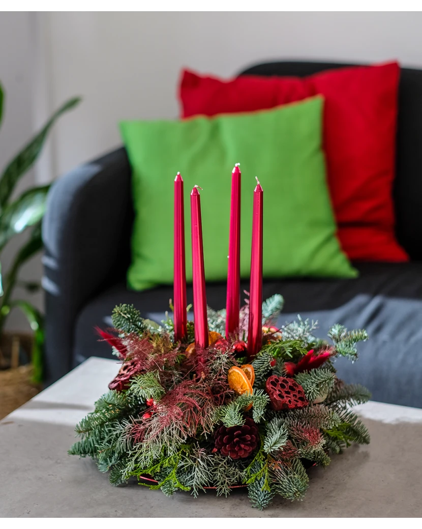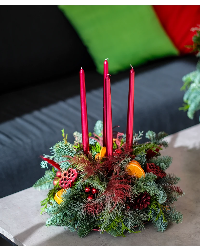 Рождественские подсвечники, букеты и цветочные коробки Frutiko созданы в духе современных тенденций, которые делают акцент на натуральных материалах и нежных, элегантных цветах. Этот адвентский подсвечник украшен ароматной хвоей, сушеными цветами и натуральными декорациями, благодаря которым он прекрасно дополнит рождественскую атмосферу любого дома. Это современная альтернатива классическому адвентскому венку — четыре адвентские свечи расположены рядом друг с другом, что выглядит лаконично, оригинально и подходит для стола, комода или в качестве милого подарка в виде стильного рождественского украшения.