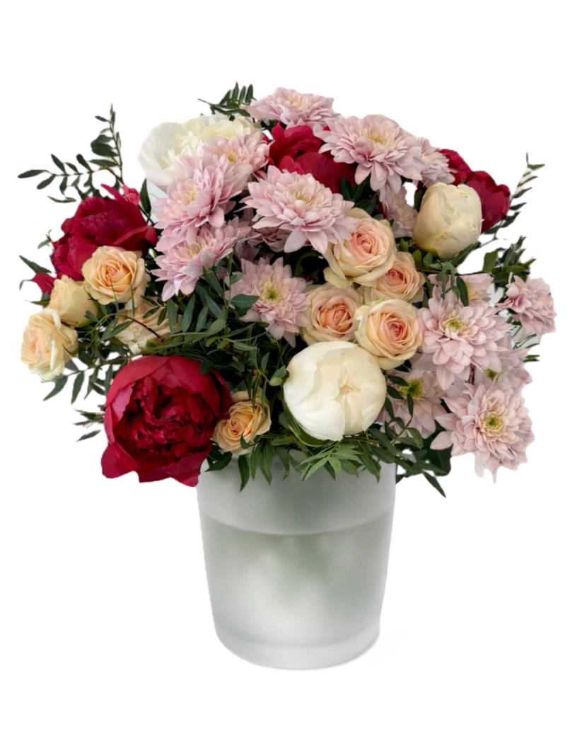 Пионы — одни из самых ароматных и красиво цветущих цветов. В последние годы их популярность значительно выросла, и флористы Frutiko.cz создали прекрасный букет, сочетая их с хризантемами и кустовыми розами.