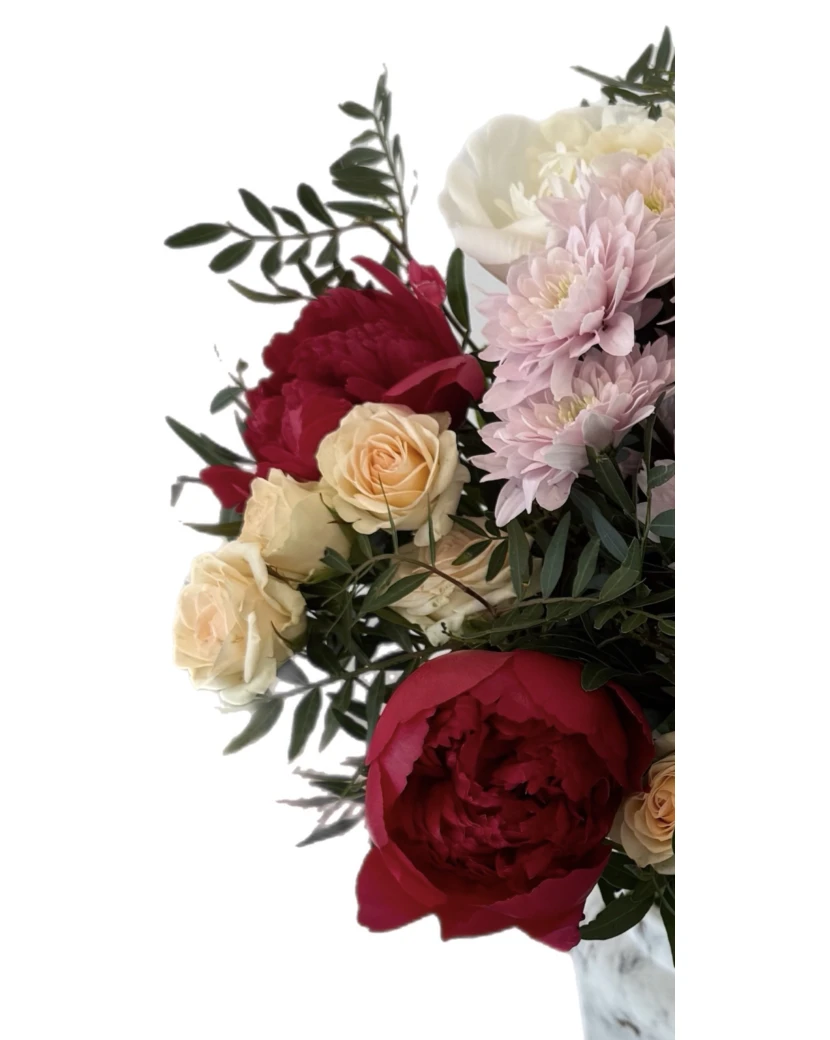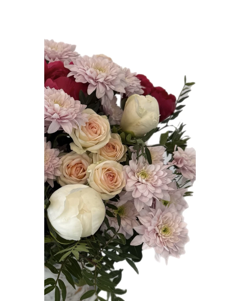 Состав: кустовые розы, Мастиковое дерево, пионы, хризантема