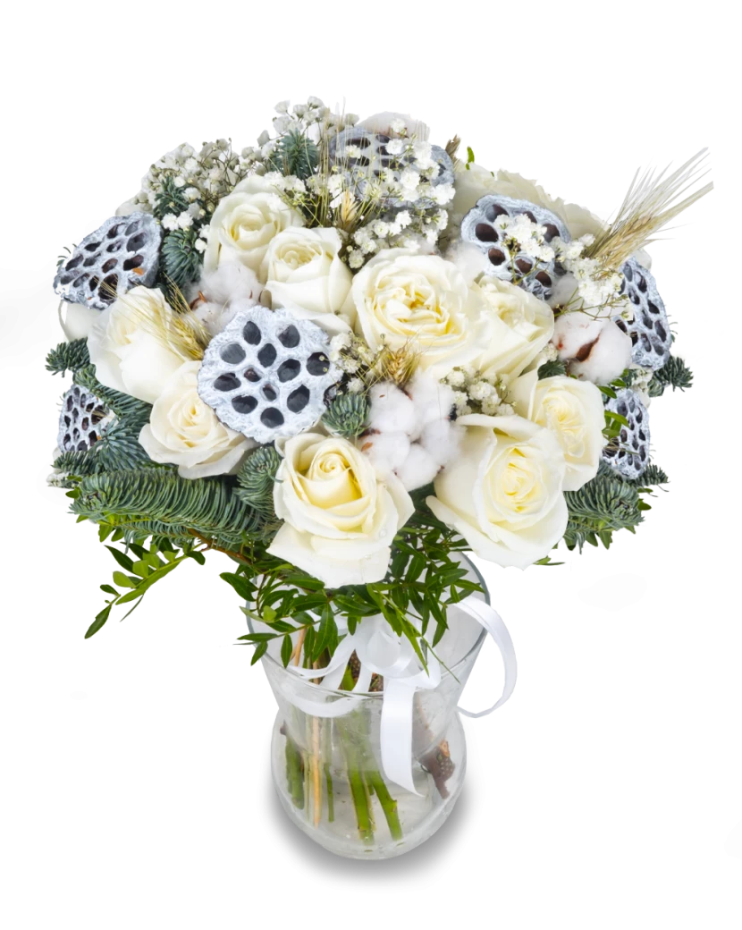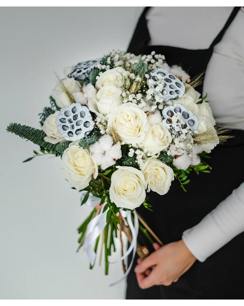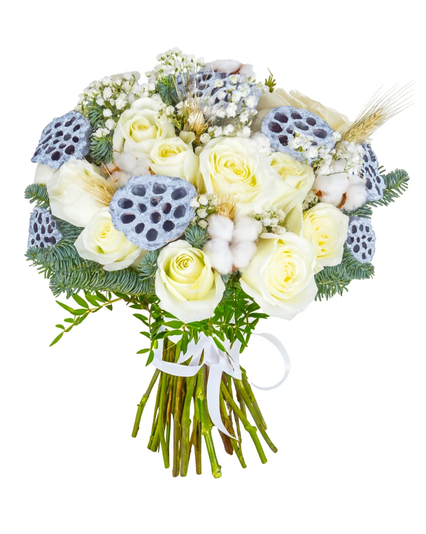 Красивый зимний букет, который дышит атмосферой заснеженного пейзажа. Этот богатый букет состоит из белых роз, фаты невесты, хвои, колосьев проса, хлопка и сушеных лотосов. Цветок имеет очень сдержанный и элегантный вид. Наши курьеры доставят его по всей Чехии в подарочной упаковке с поздравлением.